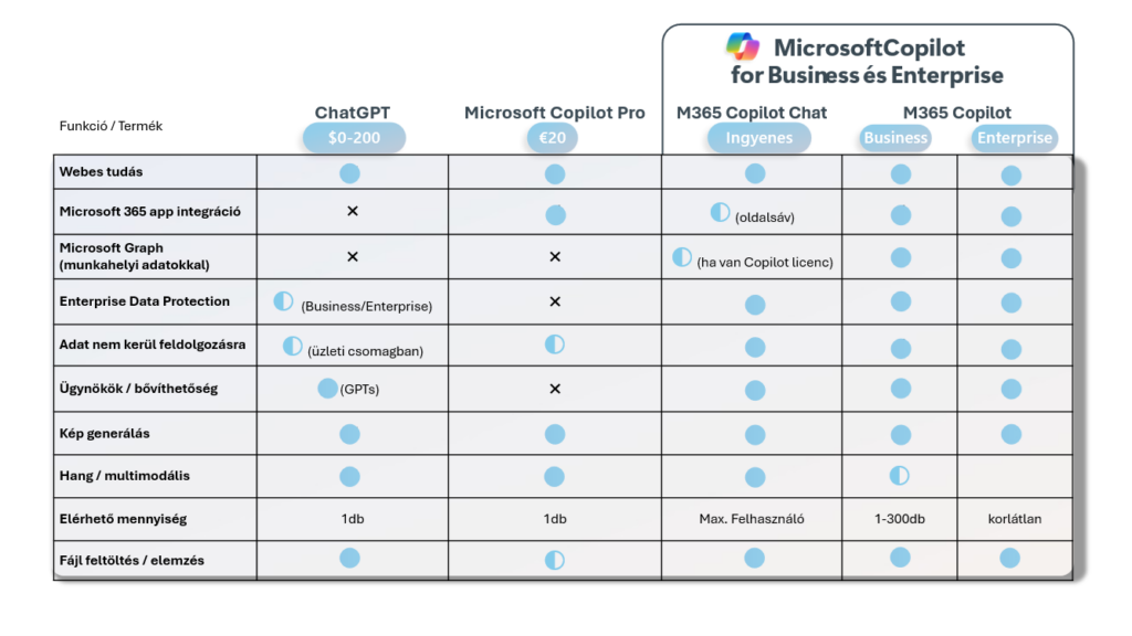 •  Microsoft 365 Copilot – A 3 kiadás közül ez az igazi nagyágyú, hiszen tartalmaz minden szükséges csúcstechnológiát amelyre egy vállalatnak az irodai környezetben, nagyjából közepes szinten szüksége lehet. Ez már fizetős változat és 2 kiadás létezik belőle. Az egyik a Microsoft 365 Copilot Business, illetve Microsoft 365 Copilot. A két licenc között az a különbség, hogy a Business-t csak Microsoft 365 Business csomagokhoz adhatóak és egy tenantban maximum 300db lehet belőlük. Az Enterprise változatból korlátlan mennyiségben és mindegyik csomagokhoz használhatóak. Funkcióban jelenleg különbség nincs, de árban annál inkább. A fizetős Microsoft 365 Copilot változatok a képességeiben több lehetőséget is nyújtanak a Chat változattal szemben. Például az Agentek létrehozása során a megosztásuk csak ilyen módon oldható meg egyszerűen, hogy azokat a kollégáink is tudják használni rajtunk kívül.