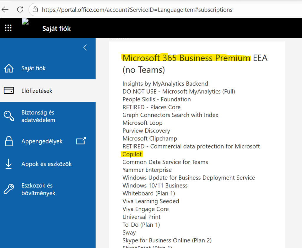 Most vizsgáljuk meg, hogy vállalati környezetben rendelkezünk e a megfelelő licenccel. A következő linken át tudjuk tekinteni az aktuálisan számunkra kiosztott licenceket és azok szolgáltatásait.  https://portal.office.com/account?ServiceID=LanguageItem#subscriptions