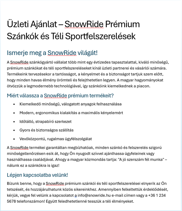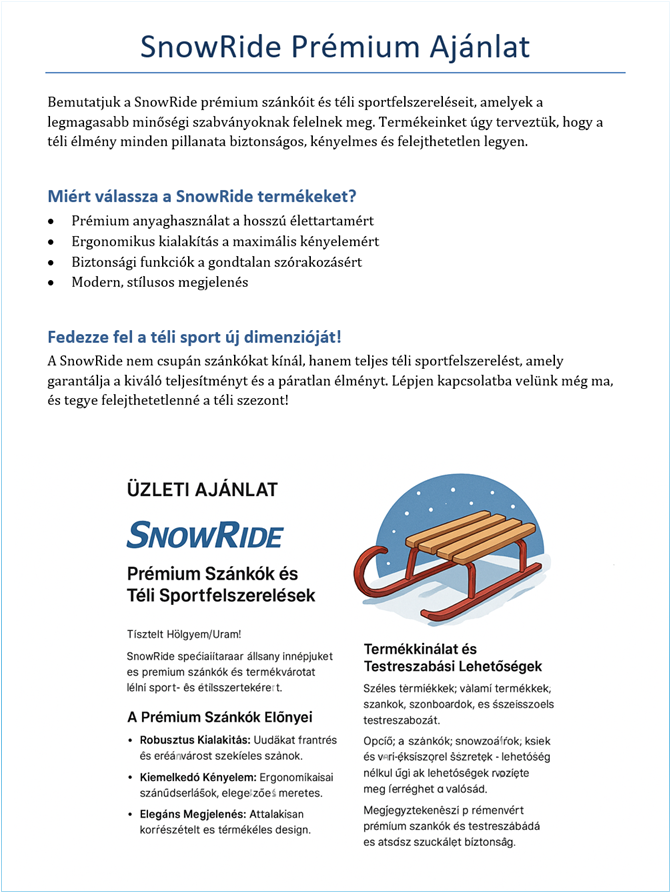 Prompt: Írj egy üzleti ajánlatot a SnowRide szánkógyártó cég nevében, amely bemutatja a prémium szánkókat és a téli sportfelszereléseket. Legyen professzionális hangnemű, 3 bekezdésben, tartalmazzon címsorokat és felsorolásokat az előnyökről. Készíts hozzá képes illusztrációkat, amelyeket illessz be a dokumentumba. A dokumentum célja, hogy az olvasóban bizalmat ébresszen a termék iránt és érdeklődést keltsen. Készüljön belőle egy letölthető docx fájl.