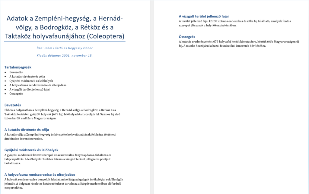 Az összefoglaláshoz Ádám László és Hegyessy Gábor Adatok a Zempléni-hegység, a Hernád-völgy, a Bodrogköz, a Rétköz és a Taktaköz holyvafaunájához (Coleoptera) című természeti leírását és elemzését választottam a Magyar Elektronikus Könyvtárból ( https://mek.oszk.hu/13900/13958/ ).